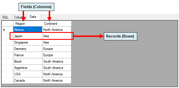 The Query window consists of three tabs: SQL Tab, Columns Tab, and Data Tab.