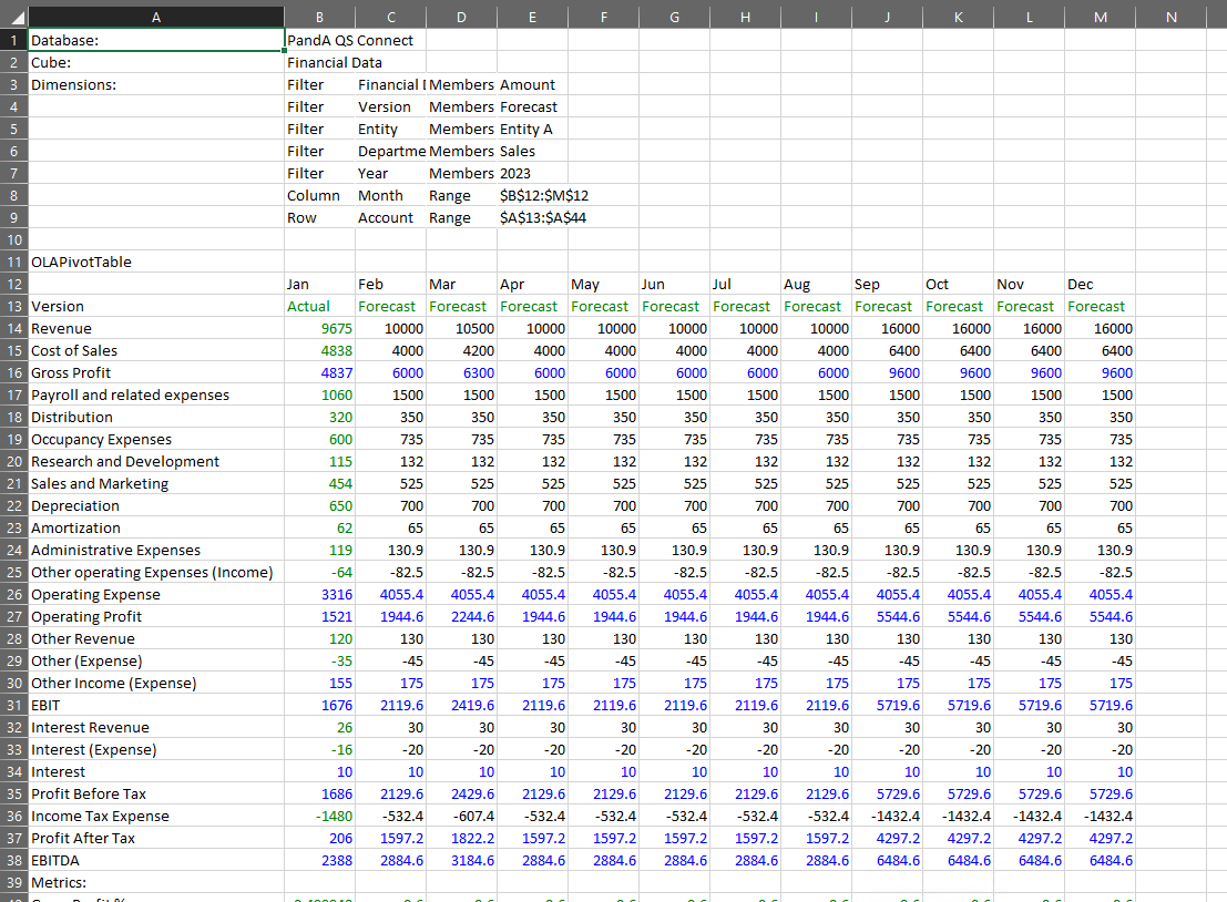 10. Once again, assuming the next user has a connection to the database, he or she will see it (assuming the same Connection name—here, PandA_QS_Connect is also used as the Connection name, although using the same name is not required), the available Cubes will be shown (here, Financial Data). Directly below, the available Slices are listed.