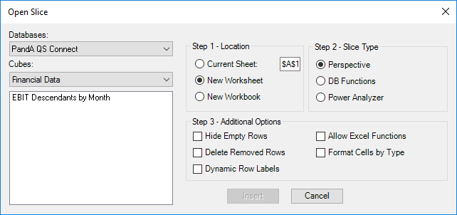 In the image, the Slice saved by the first user, EBIT Descendants by Month appears. By selecting this Slice, the user can create and insert it into a New Workbook, a New Worksheet or the Current Worksheet in the specified location with PowerExcel by using one of the Slice Types (Perspective, DB Functions, and Power Analyzer). Other Slice options are also available.