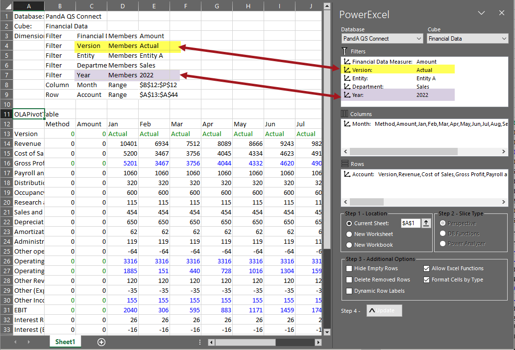 e. Back in the PowerExcel sidebar, the Version dimension now indicates Actual as the display Member.