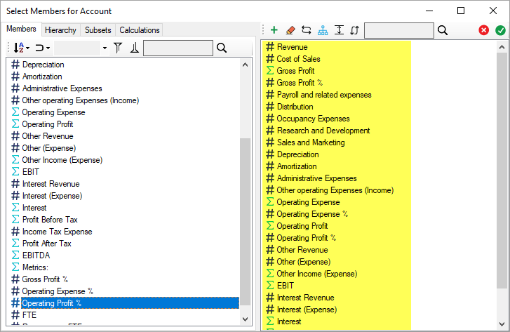 a. Go to the Rows area of the PowerExcel sidebar and double-click on the Account dimension. Currently, all Members are displayed for the Account dimension. In the Select Members dialog that appears, delete the Members displayed on the right-hand pane (via the Clear button), and then drag and drop the correct Members (see list above) from the left-hand pane to the right-hand pane.