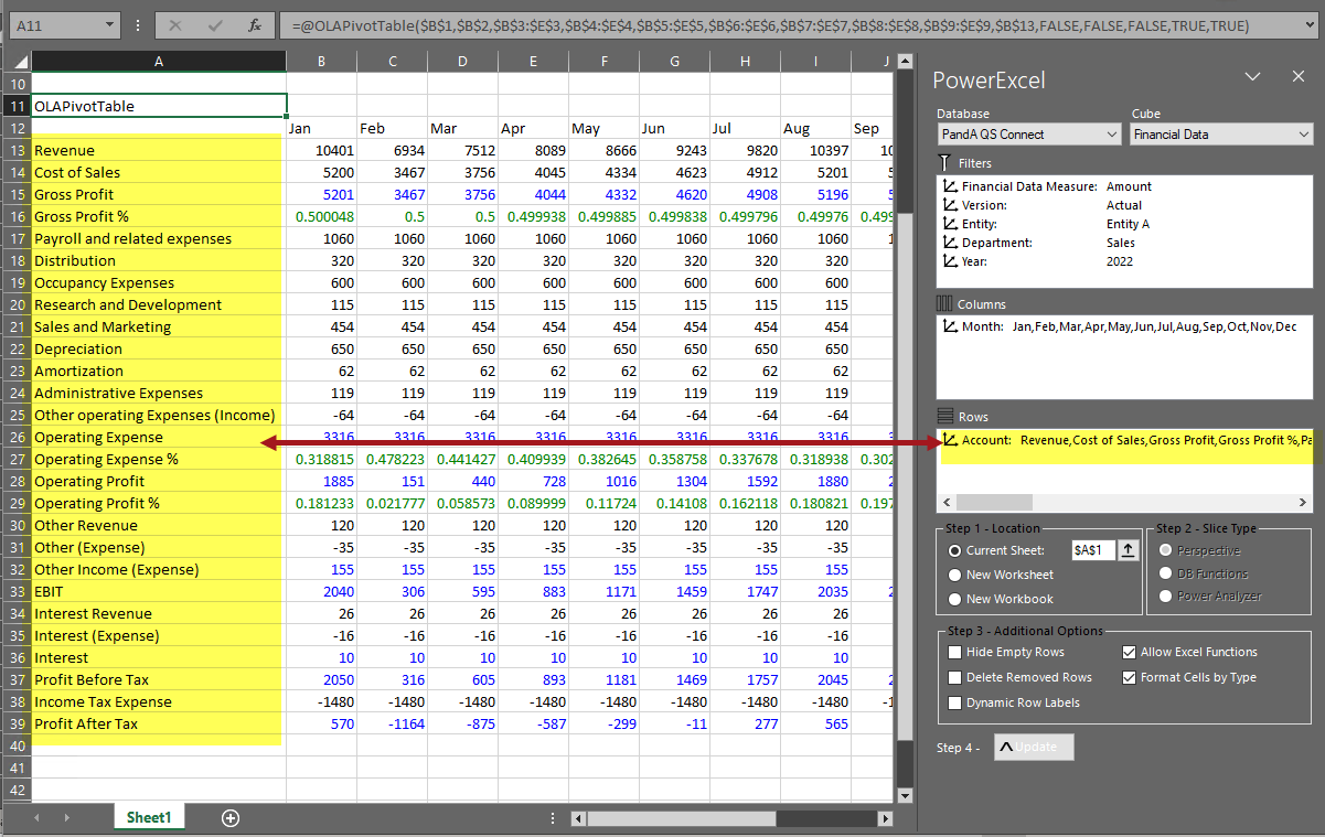 a. In the Rows section of the PowerExcel sidebar, double-click on the Account dimension.