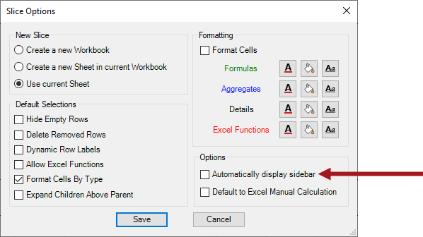 When this option is enabled, whenever a user clicks on any cell containing a PowerExcel reference, it will automatically display the PowerExcel sidebar on the right side of the Excel worksheet. Whereas when this option is disabled, you would have to click on any PowerExcel reference, and then click on the Show Sidebar icon on the PowerExcel ribbon before the sidebar is displayed.