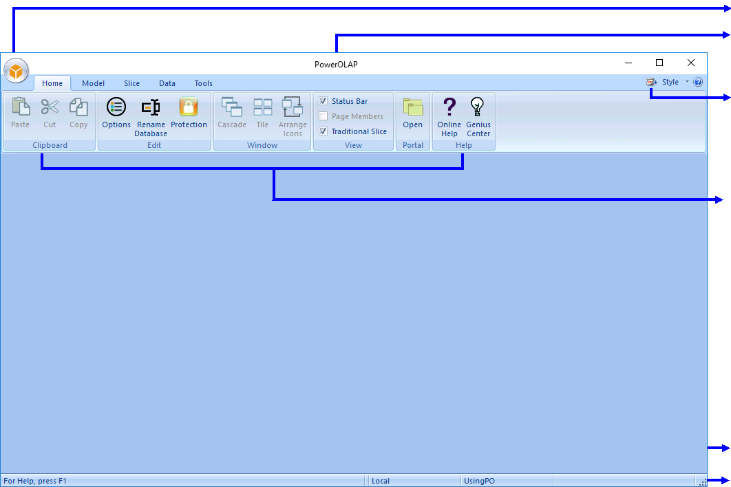 After starting PowerOLAP®, you are presented with the PowerOLAP main application window. The PowerOLAP Main Window adheres to Microsoft's Multiple Document Interface (MDI) standards. The window contains a Title Bar, Ribbon, Content Area, Status Bar and some other special Command.