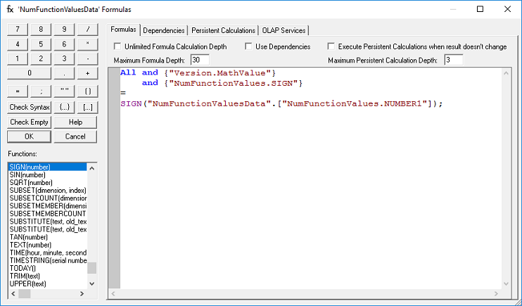 The formula above writes values into the "NumFunctionValuesData" cube to the "SIGN" member in the NumFunctionValues dimension (data is at the intersection with the MathValue member of the Version dimension). This is done by calculating the SIGN for a given number based on the number parameter that is the input supplied to the function. The SIGN function takes this parameter, and simply read the sign for the given number value and the result is obtained by returning either -1 or +1 or 0 depending upon the given number Depending upon the number parameter, the result of this function will change automatically. The formula above calculates the SIGN for the number from any number given as a parameter to the member "Number1" and the result is returned by ascertaining the SIGN for that number. This resultant value is written to the SIGN member of the "NumFunctionValues" dimension.