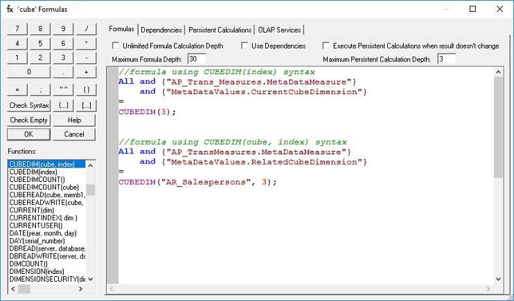 Both formulas write values into the "MetaDataValues" dimension, and one writes values to the "CurrentCubeDimension" member while other writes it to the "RelatedCubeDimension" member in the first formula, the CUBEDIM function takes only one parameter, which is the index number for the dimension. Because of supplying only one parameter to the function, the dimension name is automatically accessed from the current cube. The third dimension in the cube is returned as the result of the function. In the second formula, the CUBEDIM function takes two parameters, which are the name of a cube and the index number for the dimension. Because of supplying two parameters to the function, the dimension name is automatically accessed from the cube which is given to the formula as the parameter, in this case the "AR_Salesperson" cube. The third dimension in the specified cube is returned as the result of the function.
