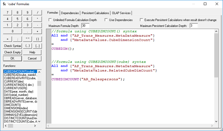 Both formulas write values into the "MetaDataValues" dimension, and one writes values to the "CubeDimensionCount" member while other writes it to the "RelatedCubeDimCount" member. In the first formula, the CUBEDIMCOUNT function takes no parameter, which is an empty call to the function. Because of not supplying any parameter to the function, the dimension count is automatically accessed from the current cube. The count of dimensions from the current cube is returned as the result of the function. In the second formula, the CUBEDIMCOUNT function takes one parameter, which is the name of a cube Because of supplying the cube name the dimension count is automatically accessed from the cube which is given to the formula as the parameter, in this case the "AR_Salesperson" cube. The count of dimensions in the specified cube is returned as the result of the function.