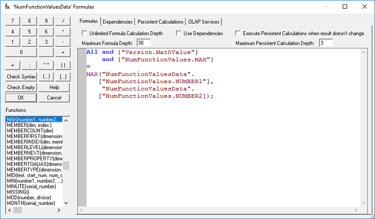 The formula above writes values into the "NumFunctionValuesData" cube to the "MAX" member in the NumFunctionValues dimension (data is at the intersection with the MathValue member of the Version dimension). This is done by calculating the MAX values from the two parameters given to the function. The parameters belong to the "NumFunctionValues" dimension. The MAX function takes the "NUMBER1" and the "NUMBER2" members as the parameters which are given to the function and it calculates the MAX value from amongst these members and the calculated result is written into the same cube in the "MAX" member of the "NumFunctionValues" dimension.