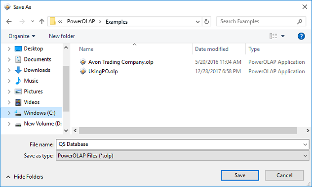 3. Browse for the directory where you want to save your database (e.g., C:\Program Files (x86)\PowerOLAP\Examples).