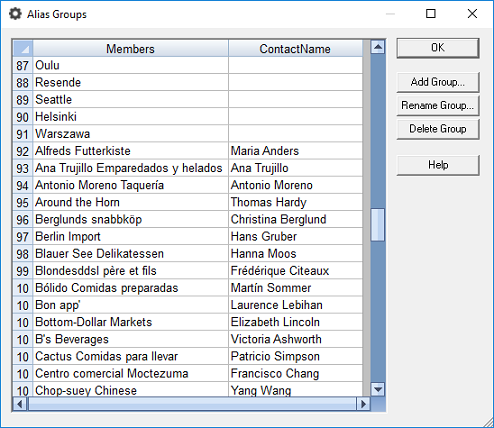 Note that because we built a Hierarchy, each Customer has been split into a Country and City Category or Hierarchy. These Hierarchies will not have Contact Names, as a Contact Name was only assigned to the Detailed member / Customer. The Alias Group has been given the name ContactName, from the field that exists in the underlying Northwind database. The appropriate unique Contact Name is listed for each Customer, in the column at right.
