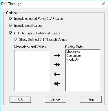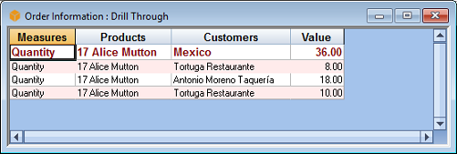 You can see that the Drill-Through feature will, as the name implies, "drill through" to display Rollup-derived data in the underlying relational source database. In other words, both the data for Antonio Moreno Taqueria (one entry, value 18.0) and for Tortuga Restaurante (2 entries, values 10.0 and 8.0) are shown, as is the value for the Mexico hierarchy (value 36.0).