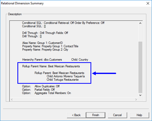 13. Once you have completed the Rollup, click Next in the dialog box to proceed to the Relational Dimension Summary message box.